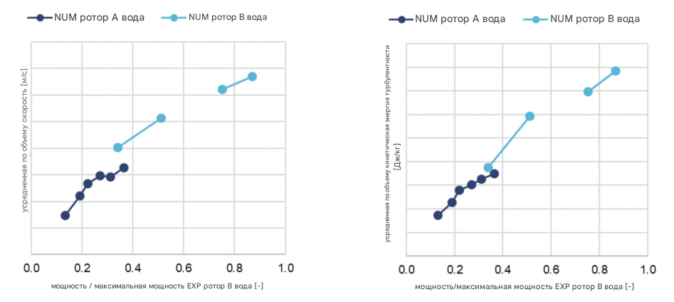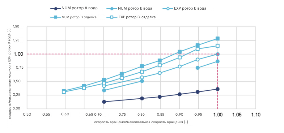 Перед использованием численной модели для более глубоких исследований или проектирования новых решений, ее необходимо проверить (валидировать). Для этого были использованы экспериментальные данные, полученные для одного из исследуемых роторов (ротор В). Основным критерием проверки являлась потребляемая мощность ротора в зависимости от скорости его вращения.На рисунке 4 представлено сравнение численных (полученных с помощью CFD-моделирования) и экспериментальных данных по мощности ротора. Все данные приведены относительно максимальной экспериментально измеренной мощности при работе с водой.