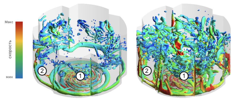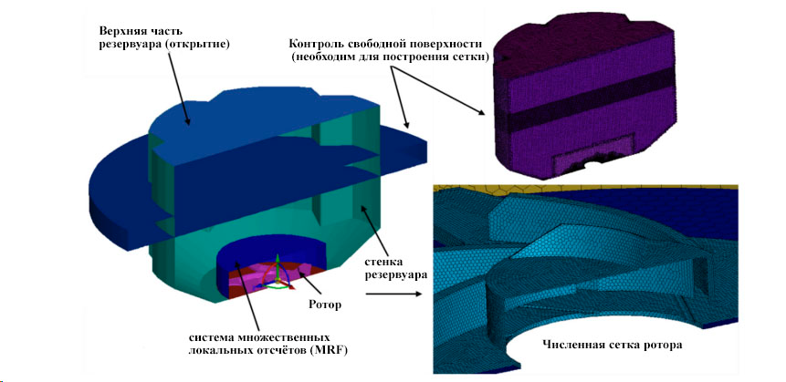 Свободная поверхность жидкости моделировалась методом объема жидкости (Volume of Fluid — VOF), что особенно важно для изучения влияния конструкции ротора на вихревые структуры жидкости.