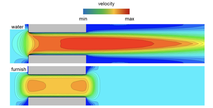 В случае волокнистой суспензии (неньютоновская жидкость) поле скоростей сильно отличается. Из-за более низкой общей скорости потока и более высокой локальной вязкости (возникающей из-за низких скоростей сдвига) формирование ярко выраженной струи не происходит. Высокое жидкостное трение препятствует развитию быстрого потока, что приводит к более равномерному и спокойному распределению скорости жидкости.
