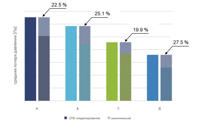 Результаты сравнения представлены на рисунке 9 оригинальной статьи и демонстрируют хорошее согласие между численными и аналитическими расчетами, хотя аналитическая модель несколько занижала значения перепада давления (примерно на 23%). Тем не менее аналитические расчеты корректно предсказывали общую тенденцию изменения перепада давления для всех исследованных конструкций отверстий.