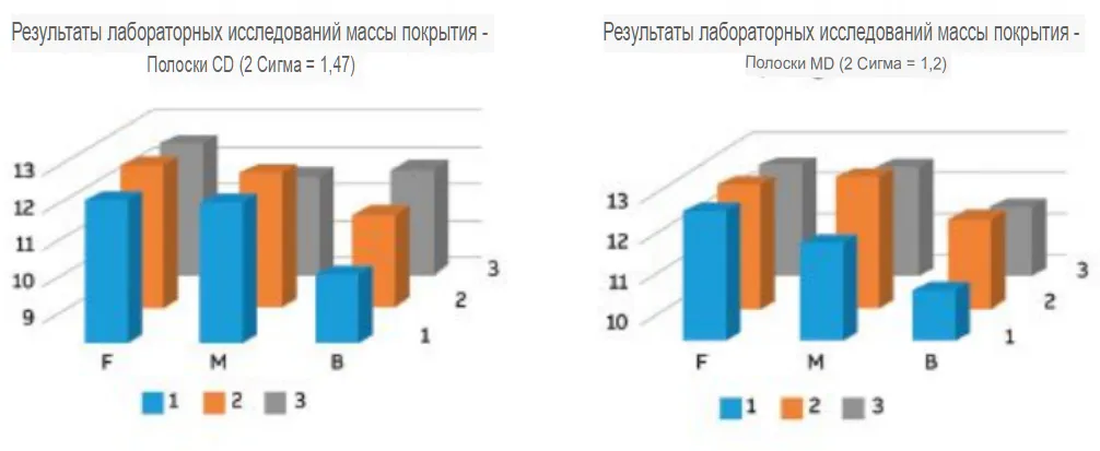 Плотность покрытия зависит от результатов лабораторных исследований в поперечном направлении (CD) и машинном направлении (MD) образцов бумаги, взятых с передней, средней и задней сторон (F, M, B) рулона бумаги. |