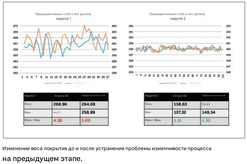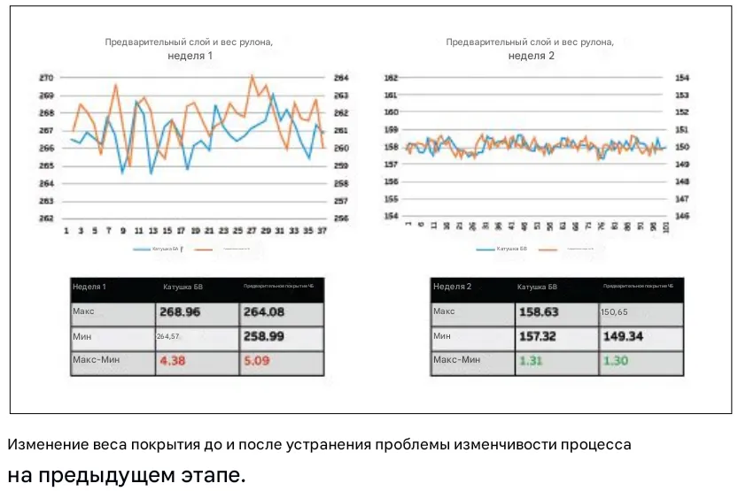 Два онлайн-сканера (измеряющих массу основы до и после нанесения покрытия) были переведены в «одноточечный режим», после чего были собраны данные о массе основы. Краткосрочная изменчивость массы основы составила примерно 5 фунтов на 3 000 фут² между максимальными и минимальными значениями. Однако менее чем за неделю, после устранения проблемы в процессе, изменчивость массы основы значительно снизилась — до 1,3 фунта на 3 000 фут². Это подтвердило, что изменчивость процесса влияла на результаты корреляции.