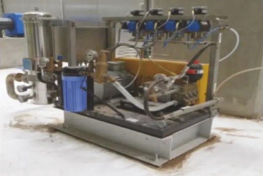 Рисунок 2. Система очистки RossJETНасосный агрегат высокого давления содержит все необходимые компоненты для безопасной эксплуатации гидравлической системы. Насос высокого давления представляет собой плунжерный насос с тремя поршнями. Этот тип насоса обеспечивает необходимое давление и поток, используя мало энергии. Например, для чистящей головки RossJET, содержащей 4 форсунки с отверстием 0,2 мм, работающей при 220 бар, требуется мощность насоса 0,54 кВт. Один насосный агрегат может обслуживать до 5 станций очистки.