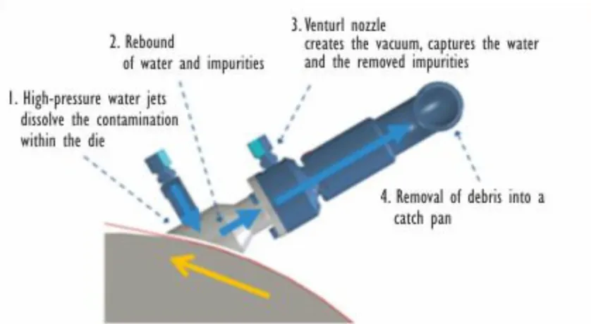 Отскок струи воды от сетки и поверхности вала переносит высвободившиеся загрязнения в чистящую головку. Вакуум, создаваемый непосредственно внутри головки, переносит загрязнения дальше к месту хранения. Для использования такой системы очистки не требуются ни вакуумные линии, ни дополнительные вакуумные насосы, ни водоотделители, используется только сжатый воздух с низким расходом.