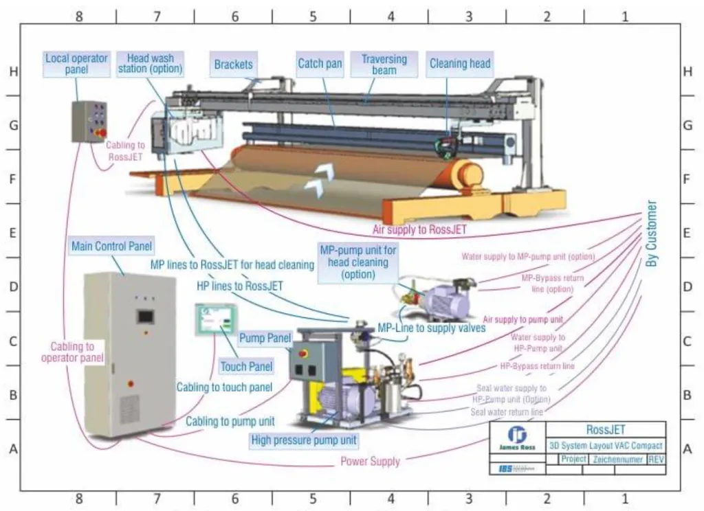 Балка сделана так, чтобы ее можно было разместить в любом положении, сохраняя пространство для установки как можно меньше. Электрические компоненты (привод и датчики) в основном находятся снаружи сушильного колпака, а также парковочного положения чистящей головки. Таким образом, простые работы по техническому обслуживанию, такие как замена форсунок, можно выполнять во время работы бумагоделательной машины. Конструкция балки обеспечивает легкий доступ к оборудованию для технического обслуживания. Станция промывки для чистящей головки, установленная в парковочных положениях, располагается на конце балки.