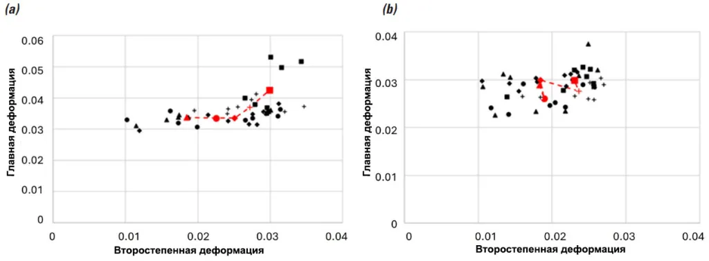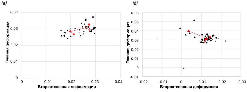 Рисунок 1. Сравнение кривых предельного формоизменения для (a) однослойного материала (190 г/м²) и (b) однослойного материала (420 г/м²).