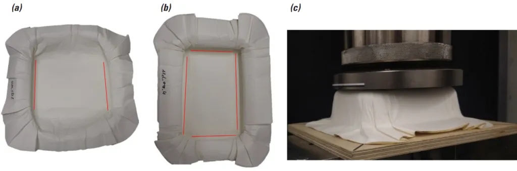 Для трёхмерного формования использовалась специально разработанная лабораторная установка. Образец закреплялся по краям и деформировался пуансоном, который вдавливал его в форму, имитируя процесс промышленного пресс-формования упаковки.