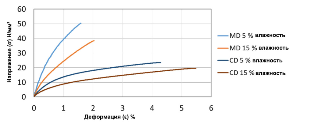 График 1. Зависимости «напряжение–деформация» для картонного материала Trayforma компании Stora Enso (MD – машинное направление; CD – поперечное направление).