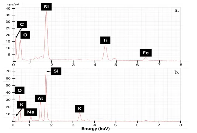 Рисунок 8 - a) SEM-EDX анализ остатков доктор-ножа показал преобладание кремния (Si) с примесями титана (Ti) и железа (Fe). b) SEM-EDX анализ загрязнителя на основе тектосиликата выявил кремний (Si), а также алюминий (Al), натрий (Na) и калий (K). |