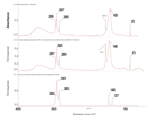 Два дополнительных пика — 1463 и 1377 см⁻¹ — частично перекрываются с широким пиком карбонатов в районе 1448 см⁻¹, однако они также характерны для углеводородных хвостов, как в маслах, так и в структуре ASA. Это значительное перекрытие объясняет, почему в спектре отложений на валу наличие углеводородного масла могло быть упущено при интерпретации.