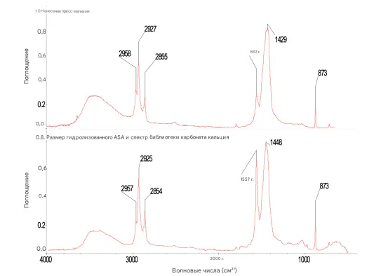 Сравнение спектров показывает многочисленные сходства: пики эталонного спектра для ASA в области 2957, 2925, 2854, 1557 и 971 см⁻¹, а также для карбоната кальция — в области 1448 и 873 см⁻¹ — все присутствуют в спектре отложений на валу. На основании высокого качества совпадения аналитик сделал вывод, что причиной отложений является гидролизованный ASA. Однако дальнейший анализ эмульсии ASA (по распределению частиц и ИК-спектру) не выявил отклонений, свидетельствующих о гидролизе или нарушении размера частиц. Поскольку на гидролиз ASA могут влиять различные факторы — от качества продукта до заряда системы и удержания тонких фракций — данные ИК-анализа и распределения частиц не исключают иные возможные причины. Возможно, ASA присутствует в незначительных количествах, а отложения образуются за счёт других веществ, с которыми он агрегируется.