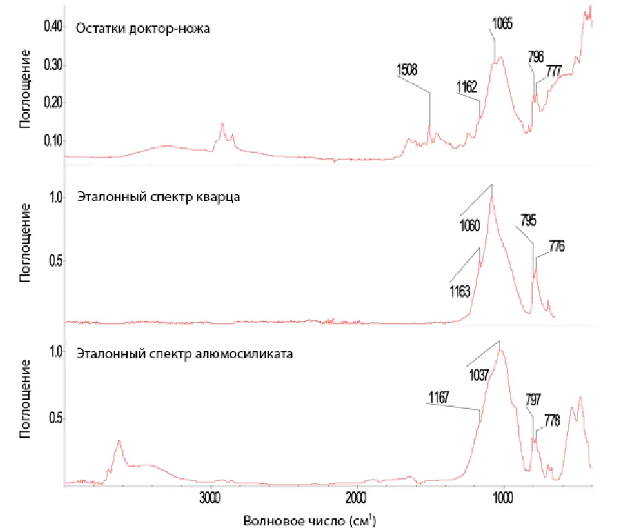 Рисунок 7. Инфракрасный спектр остатков доктор-ножа, собранных во время остановки, и эталонные спектры кварца и материала на основе алюмосиликата. |