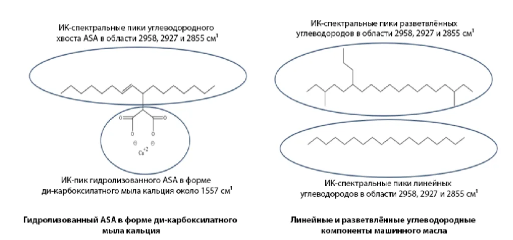 Рисунок 2 демонстрирует значительное перекрытие пиков в спектре эталонного машинного масла (2953, 2923 и 2853 см⁻¹) с пиками ASA (2957, 2925 и 2854 см⁻¹). Это перекрытие связано со структурным сходством длинных углеводородных цепей ASA и линейных/разветвлённых углеводородных цепей, характерных для индустриальных масел. На рисунке 3 представлено структурное сравнение кальциевой соли гидролизованного ASA и различных углеводородов, обычно присутствующих в образце машинного масла, с указанием характерных частот ИК-пиков. Следует обратить внимание на структурные сходства углеводородных хвостов ASA и компонентов масла: в обоих случаях пики углеводородных цепей регистрируются в области 2958, 2927 и 2855 см⁻¹, а пиковая полоса в районе 1557 см⁻¹ соответствует дикарбоксилатнойкальциевой соли ASA.