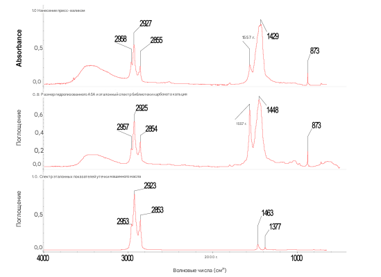 Рисунок 2. Инфракрасные спектры осаждения на пресс-вальцах, “лабораторный” эталонный спектр, который, как было подтверждено, состоит из гидролизованного ASA в форме дикальциевого мыла и карбоната кальция, а также подтвержденной утечки углеводородного масла. |