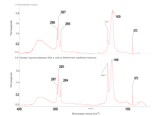 Рисунок 1. Инфракрасные спектры осаждения на пресс-вальцах и “лабораторный” спектр, подтверждающий, что он состоит из гидролизованного алкенилянтарного ангидрида (ASA) в форме двухкислотного кальциевого мыла и карбоната кальция |
