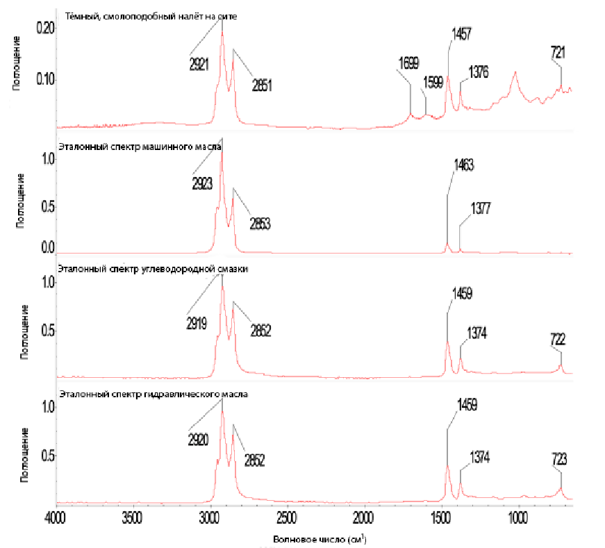 Первичный FTIR-анализ и последующий автоматический поиск по библиотеке спектров показали, что загрязнение, скорее всего, имеет углеводородную природу. На рисунке 5 представлены спектры загрязнения и совпадающих по результатам поиска веществ: машинных масел, смазок и гидравлических жидкостей.