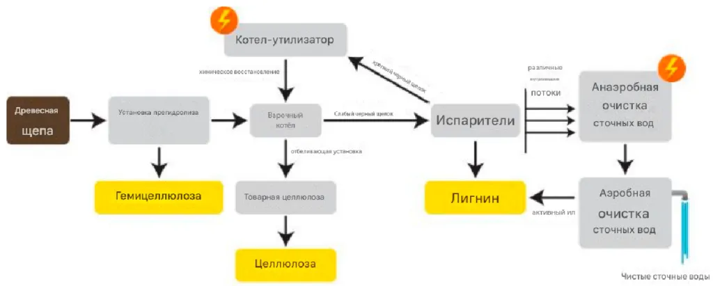 На рисунке 2 представлена схема фракционирования биомассы на биорафинирующемзаводе. В ней показаны основные этапы переработки древесных щепок, включая экстракцию гемицеллюлоз, целлюлозы и лигнина. Молнии на схеме обозначают стадии, в которых происходит высвобождение энергии. Этот процесс позволяет использовать все компоненты древесного сырья максимально эффективно, минимизируя отходы и увеличивая выход полезных веществ. |