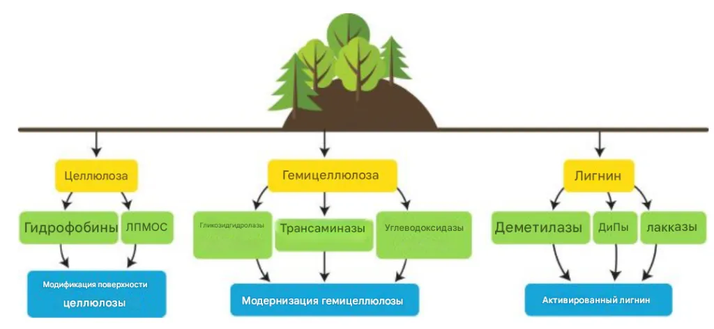 Некоторые из этих ферментов известны нам. Например, целлюлазы — это ферменты, расщепляющие целлюлозу, в результате чего получаются волокна наноразмерного уровня. Они используются для превращения древесного сырья в микро- и наноразмерную целлюлозу, а также в производстве биоразлагаемых полимеров. Гемицеллюлазы работают аналогично, разлагая гемицеллюлозу, что улучшает текстуру и свойства получаемых материалов.