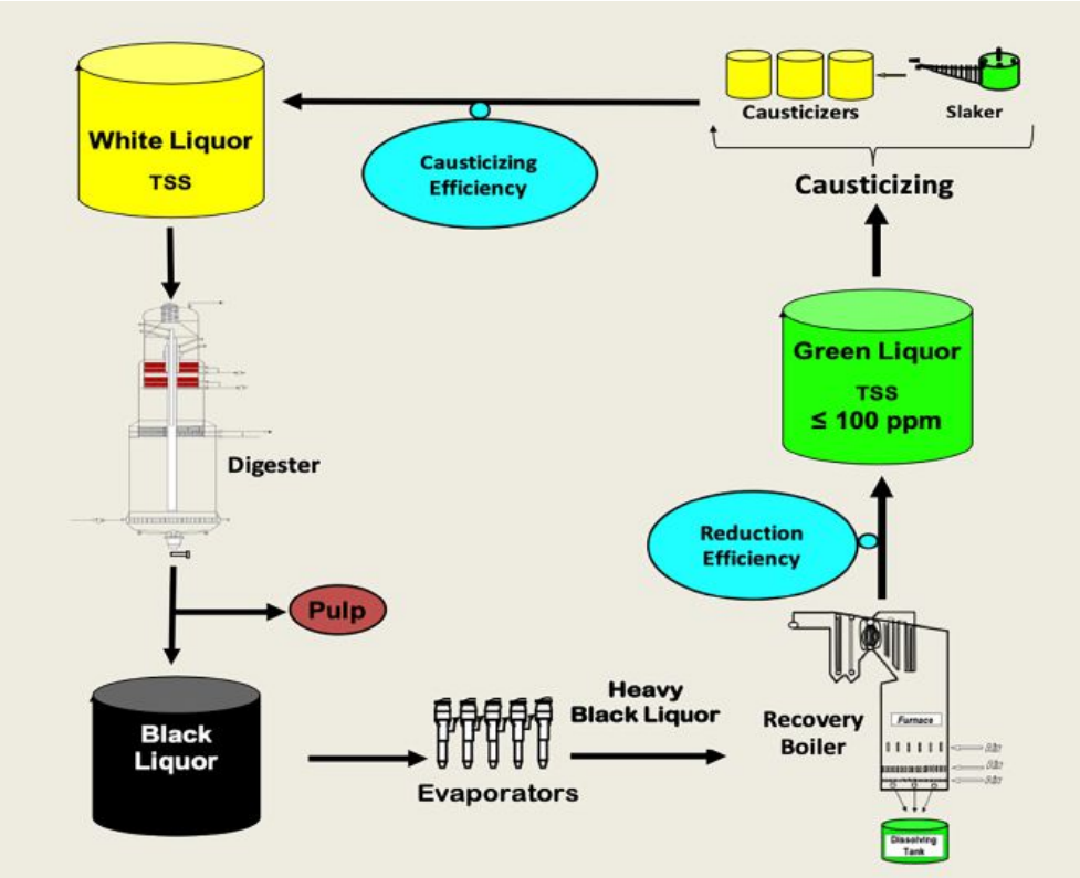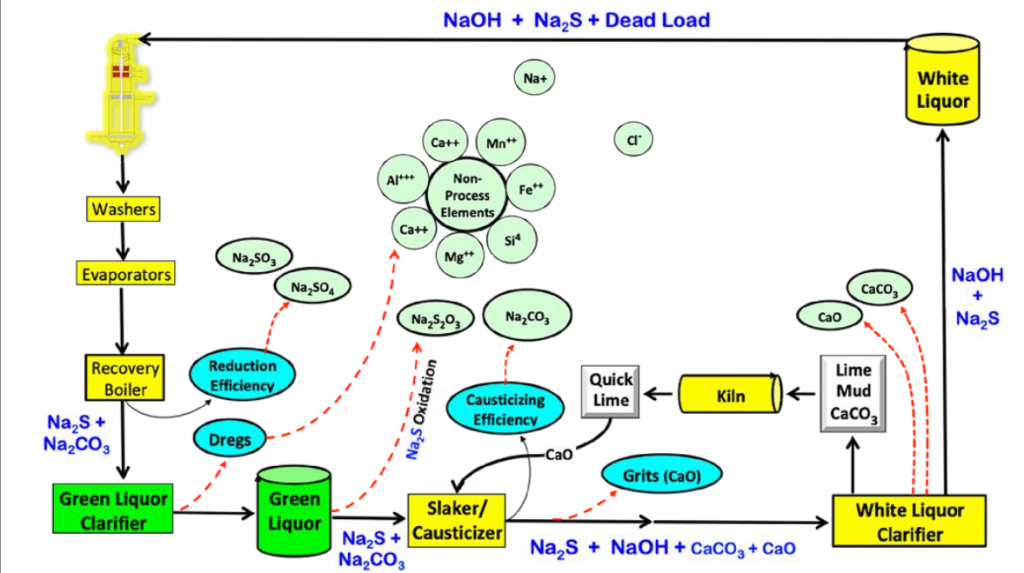 Химические вещества белого щелока (NaOH + Na₂S) реагируют при варке и выходят из целлюлозы в черный щелок, затем направляются в испарители и, наконец, в котел-утилизатор. Первоначально введенные в варочный котел химикаты восстанавливаются на уровне 97–98 %. Часть сульфата натрия (Na₂SO₄) восстанавливается в котле-утилизаторе в сульфид натрия (Na₂S) с эффективностью 90–94 %, а карбонат натрия (Na₂CO₃) в каустизаторах превращается в гидроксид натрия (NaOH) с эффективностью 80–84 % (Tran and Vakkilainen, 2016).