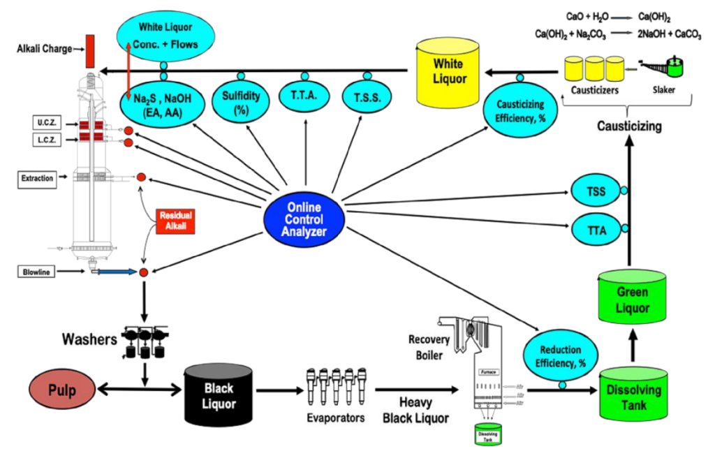 Онлайн-анализаторы доступны для определения важных параметров в нескольких областях цикла восстановления, и эти параметры могут гарантировать производство высококачественного белого щелока. Онлайн-анализаторы могут определять гидроксид натрия (NaOH), сульфид натрия (Na₂S), карбонат натрия (Na₂CO₃), активную щелочь (AA), эффективную щелочь (EA), суммарную титруемую щелочь (TTA), коэффициент каустизации (в процентах) и уровень сульфидности (в процентах).
