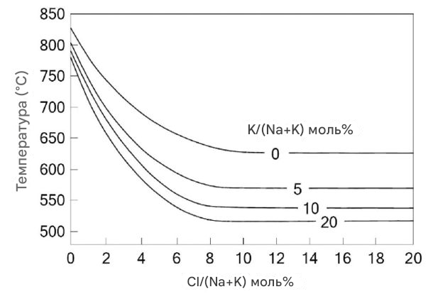 Рисунок 1. Влияние калия и хлорида на температуру образования липких отложений в котле-утилизаторе |