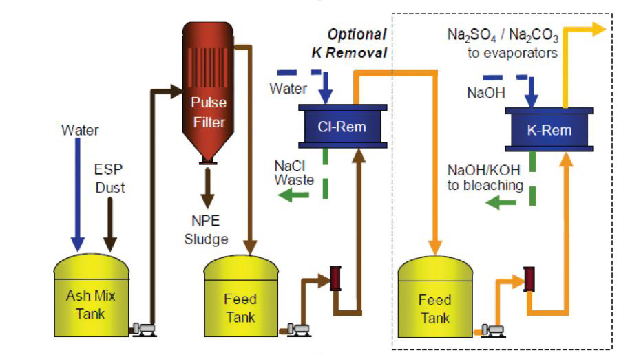 Альтернативным решением является система очистки золы электрофильтра (Precipitator Dust Purification, PDP), ранее разработанная FPInnovations и Eco-Tec Inc. Этот процесс позволяет селективно удалять хлорид и/или калий из потока растворенной золы, что делает его рабочей технологией для борьбы с отложениями, одновременно обеспечивая возврат ценных веществ в процесс.