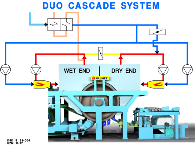 В дополнение к янки цилиндру для увеличения скорости сушки лист обдувается горячим воздухом с температурой выше 500 ˚C. Наиболее распространенная система воздушных вытяжек называется "дуо-каскадная система", рис. 4. Каждая половина вытяжки, мокрая и сухая, оснащена вентилятором рециркуляции и горелкой.