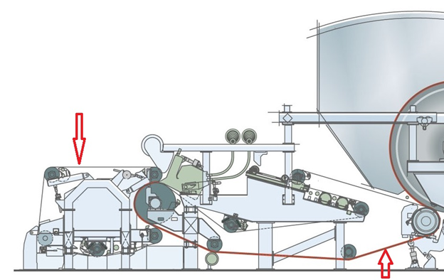 Некоторые машины имеют каландр перед рулоном, который используется для улучшения мягкости поверхности и уменьшения разброса толщины CD в листе на рулоне. Каландр используется при производстве лицевой или высококачественной туалетной бумаги. При высокой скорости работы машины необходимо использовать активные пленки для поддержки листа на сухом конце.
