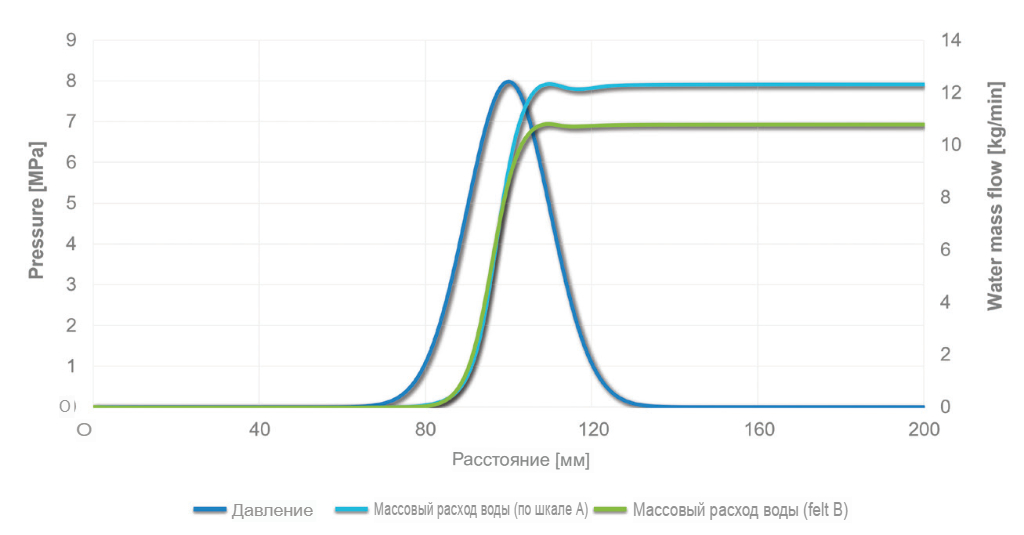 В качестве критерия эффективности обезвоживания прессовой одежды была использована накопленная массовая скорость потока воды, выходящей с нижней стороны прессовой одежды после прохождения прессового зазора (см. рисунок 7).