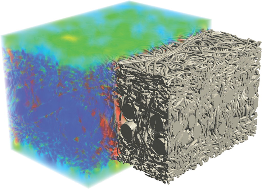 В CFD-симуляциях решаются уравнения баланса массы, импульса и энергии, используя численные методы на расчетной сетке, описывающей пористые структуры прессового сукна или бумажного полотна. В результате можно детально визуализировать распределение скоростей потока vv, концентраций cc и давления pp внутри порового объема прессовых тканей (см. рисунок 4).