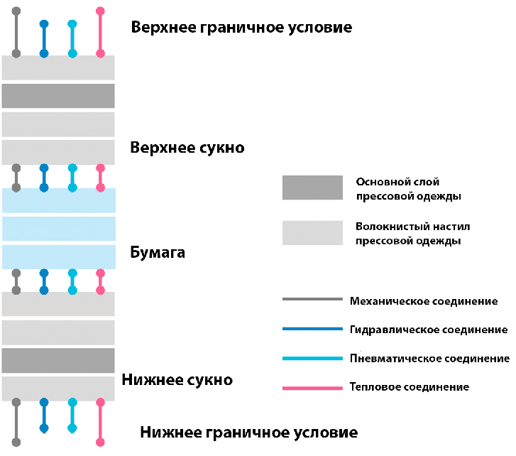 Для учета сжатия бумажного полотна и прессовой одежды в качестве эффективных моделей материалов используются либо вязкоупруго-пластическая модель волокнистого матриала, либо эмпирическая модель, основанная на кривых сжатия, полученных в лабораторных испытаниях.