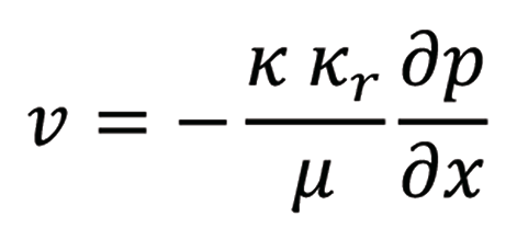 где μ — динамическая вязкость жидкости, а ∂p/∂x — локальный градиент давления. Закон Дарси описывает двухфазный поток воды и воздуха, причем вода считается несжимаемой, а воздух подчиняется уравнению состояния идеального газа.