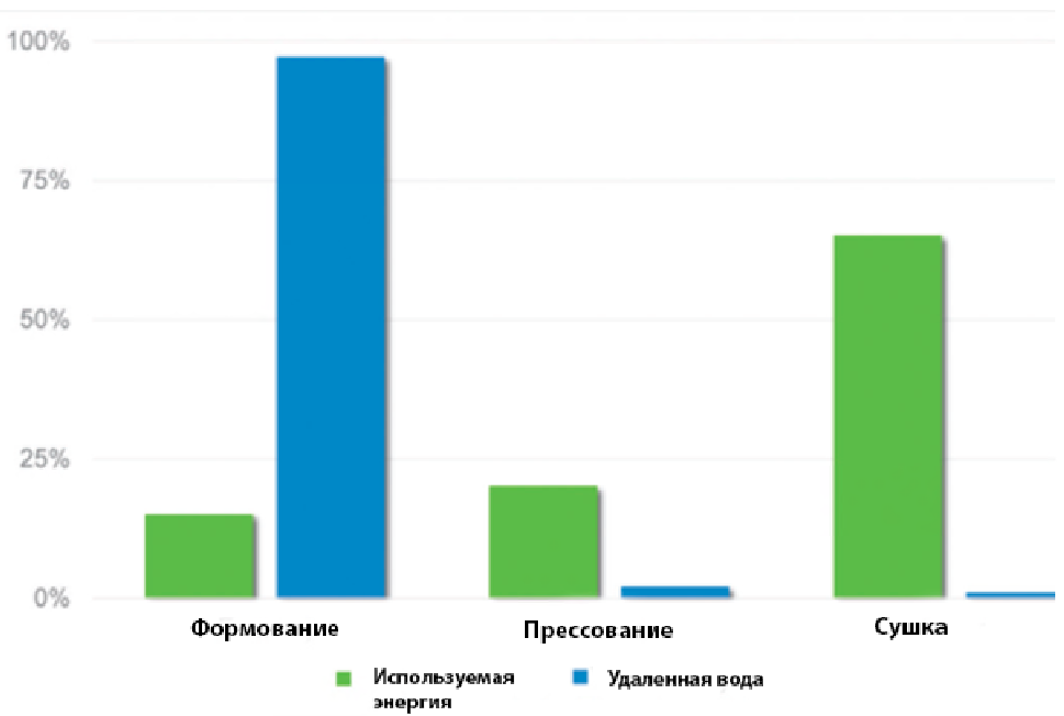 | Рисунок 1. Сравнение прессовой секции с формовочной и сушильной секциями по общему количеству удаленной воды и потребляемой энергии . |