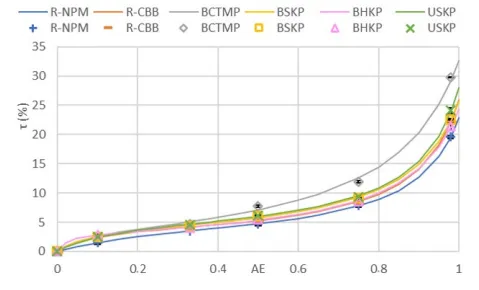 Гигроскопичность — это способность материала впитывать влагу из окружающей среды. Эта характеристика очень важна для упаковки, особенно если речь идет о продуктах, чувствительных к влаге.Волокна беленой химико-термомеханической целлюлозы демонстрируют самую высокую гигроскопичность среди исследуемых типов волокон. Это связано с большим содержанием природных гидрофильных компонентов, таких как гемицеллюлоза и пектины, которые активно притягивают и удерживают воду. Высокая гигроскопичность этих волокон делает их подходящими для упаковок, где необходимо контролировать влажность внутри изделия, например, при хранении фруктов или овощей, для сохранения их свежести.