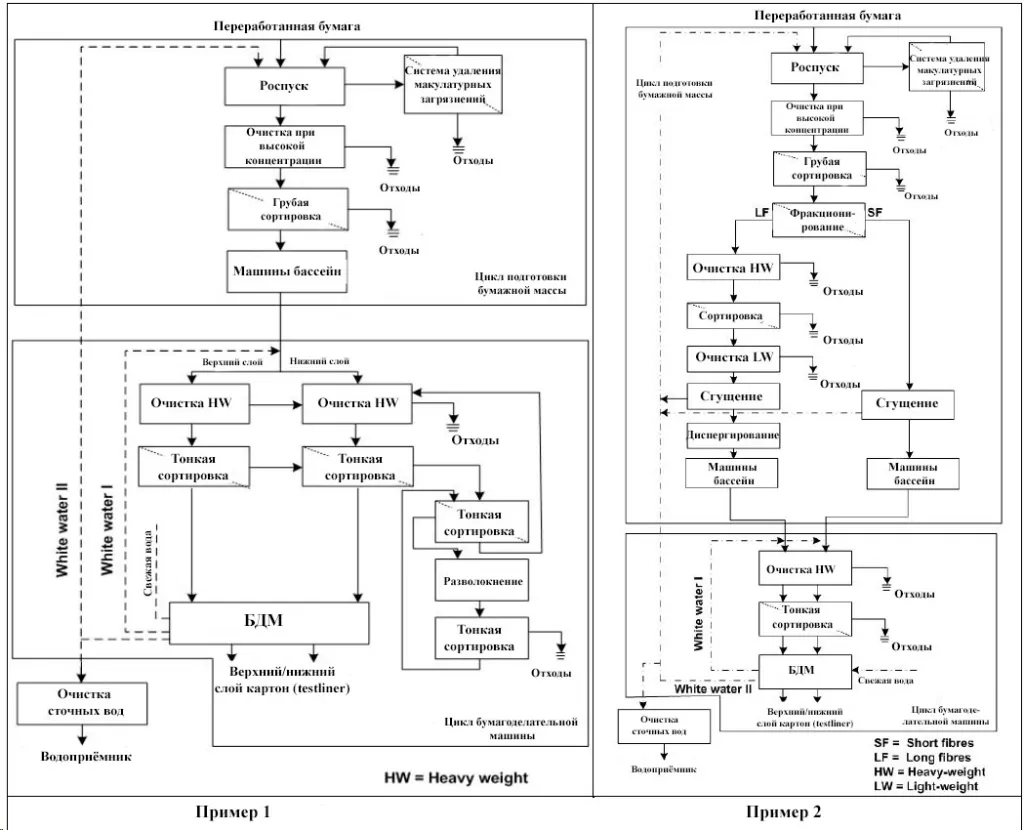 На рисунке 1 показаны два примера компоновки установок подготовки массы для переработки макулатуры при производстве двухслойного тестлайнера (в источнике представлено четыре примера). Этот сорт картона выбран в качестве примера из-за его высокого значения в общем объёме производства бумаги и картона в Европе, а также из-за доступности информации.