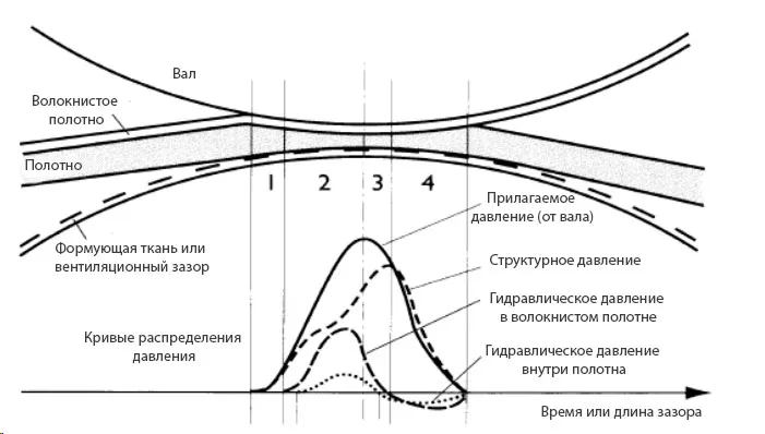 Модель Вальстрёма, приведённая на Рисунке 2, описывает принятую четырёхфазную систему обезвоживания полотна в зазоре прессового вала. Эта модель применима как к стандартным прессовым валам, так и к прессам с удлинённым зазором.
