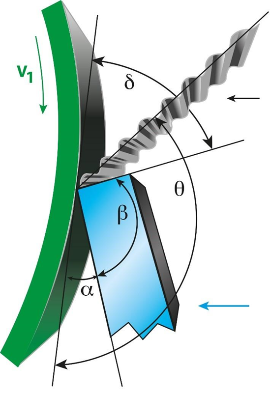 Как показано на рис. 6, данный показатель также является важным фактором при крепировании. К значимым для процесса крепирования углам относят: угол среза θ, состоящий из угла скоса держателя лезвия β, и угол износа α. Кроме того, следует учитывать высоту свободного среза лезвия или его выступа из-за наклона лезвия.