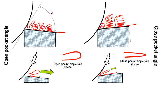 Помимо этого следует обозначить, что угол износа при скольжении лезвия α также зависит от изгиба лезвия. Износ при скольжении θ представляет собой фактический угол крепления лезвия (или угол держателя лезвия) за вычетом отклонения. При этом конечный угол износа скольжения может быть ограничен в двух случаях. Во-первых, если угол небольшой, например, меньше 15˚ по касательной к янки-цилиндру, то лист будет хуже отсоединяться. Также наблюдались случаи, когда кончик лезвия не касался листа или наоборот застревал в нем. Последний вариант часто приводил к разрыву листа. Во-вторых, если угол больше 20˚, наблюдается сильнейшее трение о янки-циилиндр, что в дальнейшем может привести к повреждениям и износу цилиндра. Таким образом, для угла наклона держателя лезвия стандартными показателями являются 17˚-19˚. Вместе с тем при производстве бумаги угол лезвия может составлять до 60˚ для увеличения угла раскрытия крепового кармана. Так при угле раскрытого кармана в 90˚, как правило, уменьшается пухлость бумаги и увеличивается плотность структуры крепа. Данные свойства характерны для тиссью, отличающихся высокой мягкостью. Вместе с тем как показано на рис. 7, амплитуда крепов уменьшается при увеличении угла раскрытия крепового кармана. При уменьшении угла раскрытия крепового кармана возрастает амплитуда крепов, что приводит к повышению пухлости бумаги. Кроме того, такой лист не будет приятен на ощупь. Выступ лезвия будет определять точную настройку угла наклона кармана. При этом при увеличении кармана угол наклона лезвия может увеличиться до 3˚. Вместе с тем, при большом выступе лезвия происходит усиление вибрации лезвия, при такой вибрации лезвие может вовсе пропускать лист. В связи с этим, стандартный выступ лезвия для держателя лезвия составляет 20-25мм.