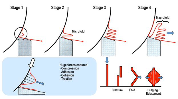 Помимо того, что лист растягивается в Z-направлении (вверх и вниз), при процессе крепирования некоторые волокна скручиваются и изгибаются. В зависимости от адгезионной прочности растянутый и деформированный лист отклеивается от поверхности цилиндра на небольшое расстояние (рис. 2, этап № 1). Чем выше адгезионная прочность, тем короче будет данное расстояние. Таким образом, прежде чем лист вновь прижмется к сушилке, на нем образовывается небольшая складка или креп. Затем данный процесс вновь повторяется. При этом каждый креп возможно рассмотреть визуально, используя микроскопы с небольшой разрешающей способностью. Следует отметить, что обычно количество крепов составляет 20-40 штук на сантиметр. В связи с этим возможно сделать вывод, что частота крепирования может достигать от 50 до 120 кГц.