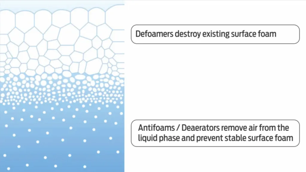 - Пеногаситель уменьшает или разрушает существующую поверхностную пену