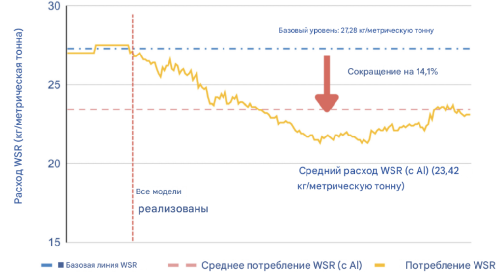 | Результаты применения ИИ показали снижение расхода смолы для влажной прочности (WSR) с 27,28 до 23,42 кг/т за 90 дней. |