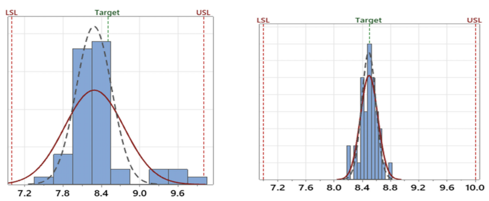 | Возможности процесса (а) до и (б) после внедрения оптимизации с помощью искусственного интеллекта (ИИ) |