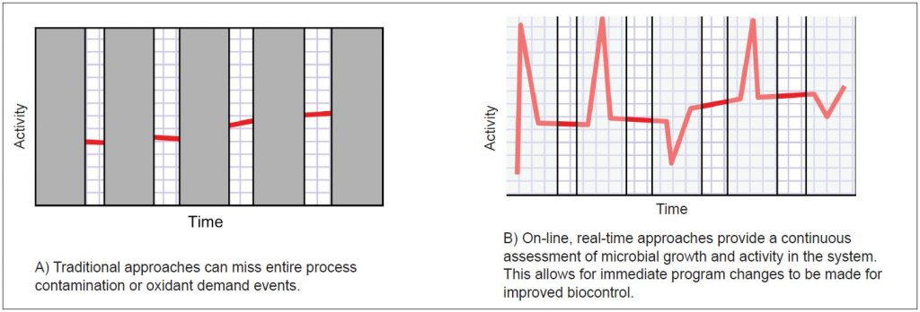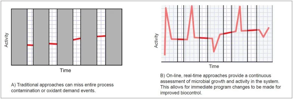 Традиционные методы мониторинга (например, подсчет количества колоний и аденозинтрифосфата, АТФ) не могут анализировать образцы технологической воды достаточно часто, чтобы обнаружить изменения, которые сделают программу биоконтроля неэффективной. Кроме того, традиционные методы микробиологического мониторинга трудоемки, а реагенты могут быть дорогостоящими. Эти подходы могут позволить диагностировать проблемы, связанные с ростом микроорганизмов, однако отсутствие средств мониторинга в реальном времени препятствует возможности проактивного реагирования на изменчивость процесса для предотвращения сбоев в производстве.