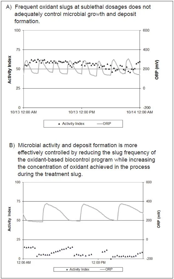 Слишком частые выбросы могут не обеспечить надлежащего контроля из-за усилий по минимизации потребления химических веществ, что приводит к недостаточной концентрации окислителя на пике распространения. Кроме того, простое измерение ОВП в режиме реального времени не дает адекватной информации о работе программы биоконтроля на основе окислителей. Эти измерения могут указывать на то, что дозировка достигла целевого значения ОВП. Однако это целевое значение ОВП может не соответствовать адекватному контролю роста микроорганизмов и образованию отложений. Существует необходимость сочетать ОВП с активностью в текущий момент, чтобы понять влияние программы биоконтроля на основе окислителей и целевых показателей ОВП на рост микроорганизмов в режиме реального времени. На рис. 5 показано, что одинаковые уровни обработки приводят к различной степени микробиологического контроля в зависимости от частоты и концентрации окислителя.