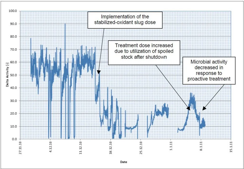 Кроме того, стратегия мониторинга в режиме реального времени позволила выявить повышение микробной активности после запуска тканевого аппарата после длительного простоя. Утилизация испорченного сырья привела к увеличению потребности системы в окислителях, что привело к перегрузке программы биоконтроля на основе окислителей.