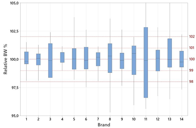 Для сопоставимости вес каждого рулона был разделен на среднее значение его производителя. Таким образом, вес рулона, равный 101 % на следующей диаграмме, на 1 % выше веса других рулонов данной марки.