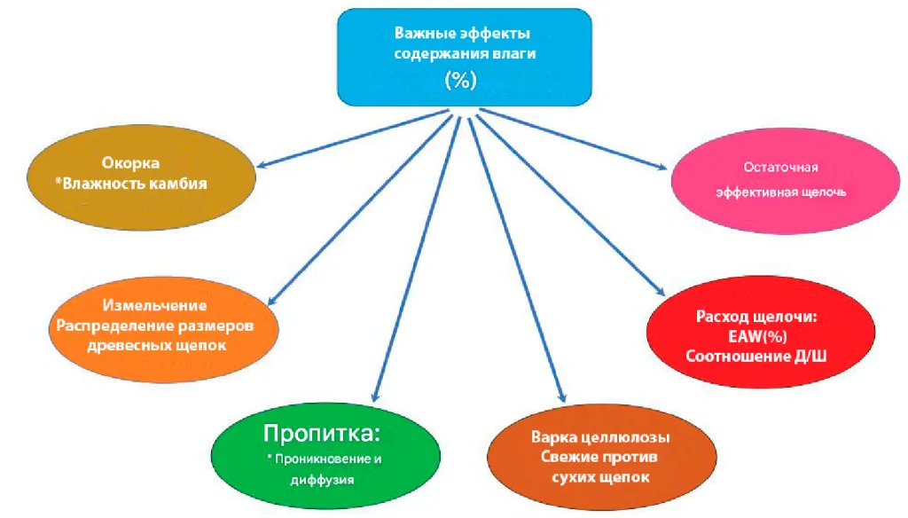 Кроме того, содержание влаги в древесной щепе влияет не только на коммерческие аспекты, но и на такие процессы, как удаление коры, измельчение (например, распределение размеров щепы) и крафт-варка (например, пропитка, свежая с сухой щепой, заряд щелочи, остаточный эффективный щелок), среди прочих. См. Рисунок 1.