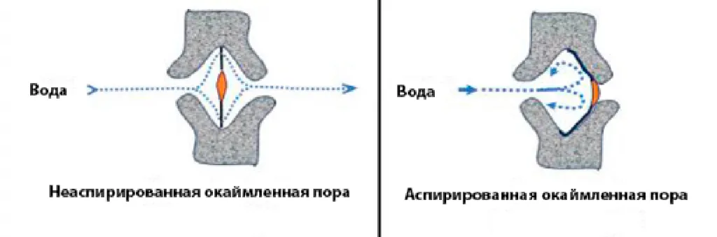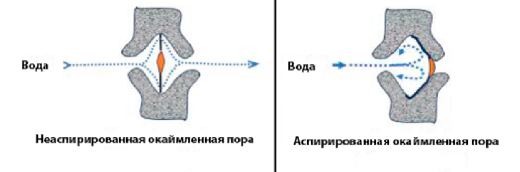 Рисунок 4: Поток воды через неаспирированные и аспирированные окаймлённые поры |