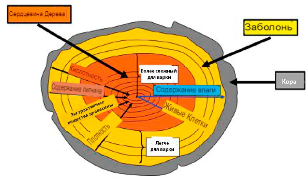 При использовании целых брёвен древесные щепы содержат как заболонь, так и ядро. Физические и химические свойства древесины постепенно изменяются от периферии к центру ствола (сердцевине), и наиболее выраженные различия наблюдаются между наружными и внутренними годичными кольцами. Следовательно, при варке целых брёвен необходимо учитывать широкий диапазон плотности древесины, pH, содержания лигнина, влажности и других характеристик (Quinde, 2020). См. рисунок 5.