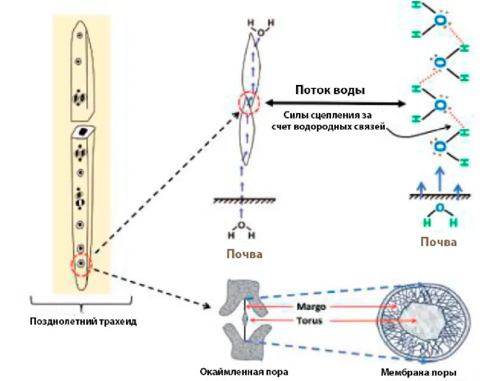 Перемещение воды от корней к верхним частям дерева (листьям и ветвям) осуществляется через сосуды (у лиственных пород) или трахеиды (у хвойных пород). Трахеиды соединяются друг с другом через небольшие полости, называемые окаймленными порами (bordered pits), которые функционируют как предохранительные клапаны: они позволяют воде проходить, но ограничивают распространение пузырьков воздуха или других нежелательных веществ (McElrone, 2013).
